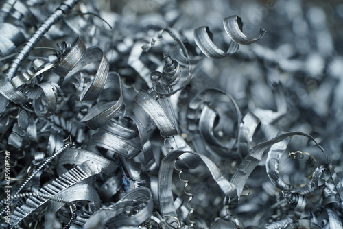 Steel scrap materials recycling. Aluminum chip waste after machining metal parts on a cnc lathe. Closeup twisted spiral steel shavings. Small roughness sharpness,