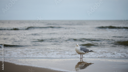 Mewa stoi na brzegu morza, Wiatr, szaro, buro, ponuro. Tonacja niemal monochromatyczna.