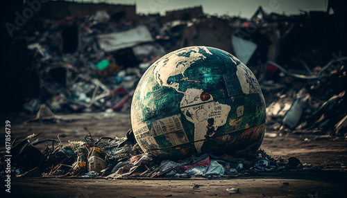 Erdball Welt Erde als Planet in der Müllhalde auf dem den Schrottplatz liegt im Müll als quasi Weltuntergang durch Klimawandel und letzte Generation symbolisch Darstellung digital Generative AI
