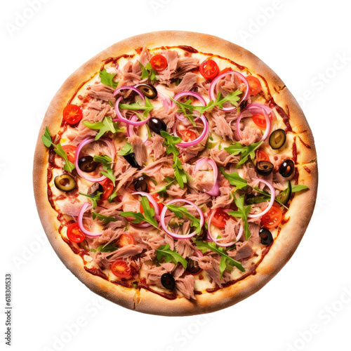 A delicious Italian tuna pizza photographed from above, fast food, white background, isolated, generative ai