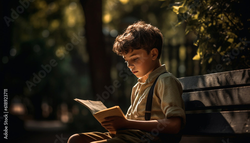 Cute schoolboy reading book in autumn forest solitude generated by AI
