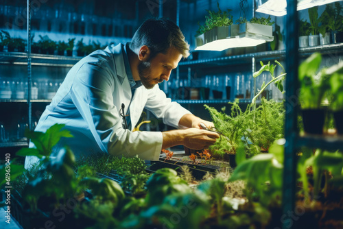 Botanist inspecting plants in a lab using genetic engineering and hydroponics, Generative AI