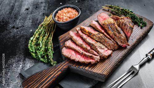 Sliced grilled roast beef with fork for meat on wooden cutting board. Black background. Top view.