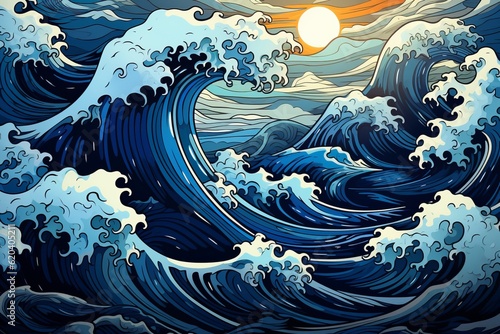 Cartoon Cute Doodles Ocean Waves Seamless Pattern, Generative AI