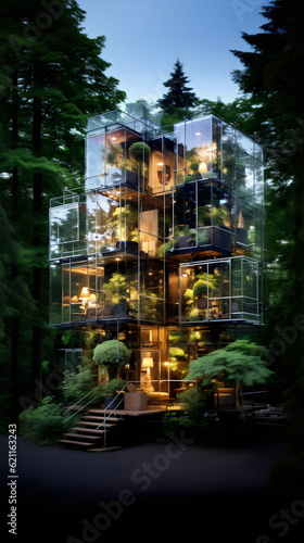 angular glass house in the woods, travel holiday accomodation made with generative ai