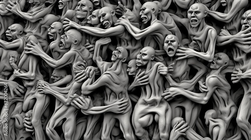Sculptural composition on the theme of purgatory or hell with many writhing bodies. The dark faces of the creatures scream and beg. Generative AI illustration for cover, interior design, decor, print.