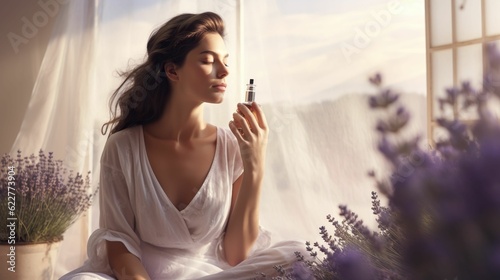 Woman enjoying the pleasant scent of her perfume and lavender blooms. Ai generated