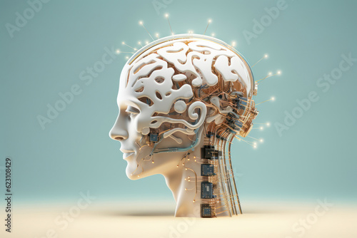 Tête humaine de profil avec un cerveau connecté avec des circuits imprimés symbolisant l'intelligence artificielle et l'homme augmenté sur un fond pastel