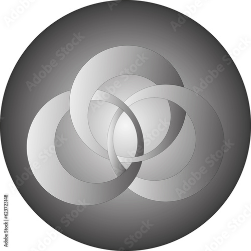 Ilustracja przedstawiająca figurę składającą się z trzech przenikających się wzajemnie okręgów, umieszczonych w szarym kole.