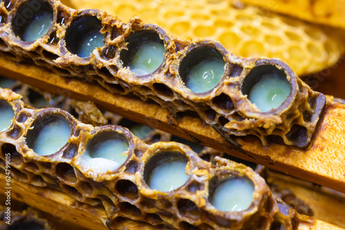 Royal jelly. Opened queen cups full with royal jellies in focus