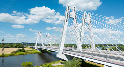 Modern suspension bridge on the outskirts of Krakow. Bird's-eye view shot by a drone. Cardinal Franciszek Macharski Bridge