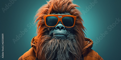 Hipster Bigfoot portrait dressed in clothing. Conceptual liberal Sasquatch disguised in human clothes.