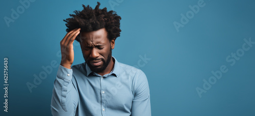 Afro american man with headache or discomfort on blue solid color background. Image generative AI.