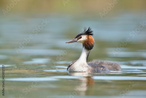 Great crested grebe is swimming in the water (Podiceps cristatus) water fowl in the nature habitat. Wildlife scene from nature.