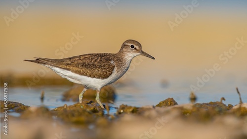 Common Sandpiper (Actitis hypoleucos) is a wetland bird that feeds on mollusks near lakes and streams. It is a common bird in Asia, Europe, Africa and Australia.