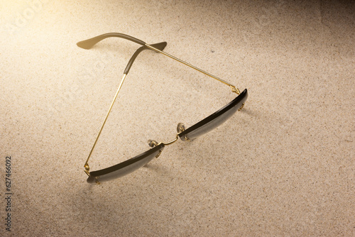 Okulary damskie plażowe, przeciwsłoneczne w złotych ramkach, leżące na piasku w ostrym słońcu. Lato i akcesoria plażowe. Ochrona przed słońcem