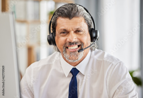Call centre, happy and portrait of a man with a headset and a smile for customer service. Face of a mature male consultant or agent for technical support, help desk or crm advice and telemarketing