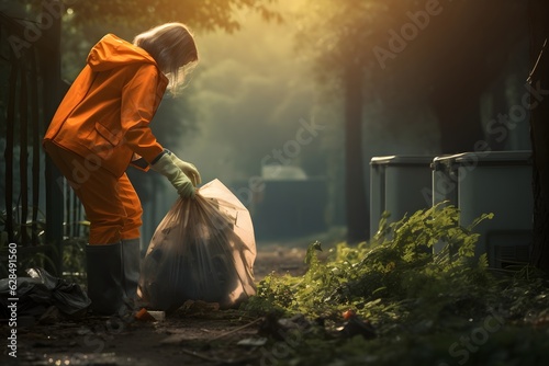 Woman wearing protective gear diligently picking up trash in a public park, exemplifying the spirit of community service and environmental responsibility