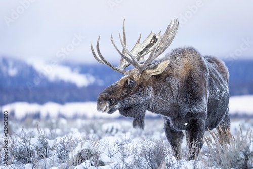 Majestic moose is resting in a tranquil wintery landscape, featuring a snow-covered field