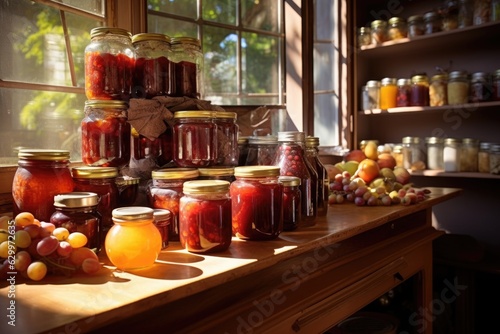 fruit preserves and jams in a pantry, lit by warm sunlight