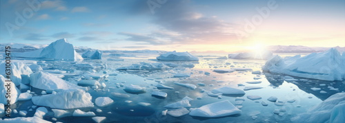 Ice sheets melting in the arctic ocean or waters. Global warming, climate change, greenhouse gas, ecology concept. wide format, Hand-edited generative AI.