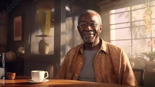 African American Senior Older Man Drinking Coffee Mug in the Morning on a Sunny Day on His Porch. Concept of Relaxation, Waking Up, Enjoyment, and Caffeine.