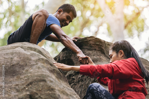 Silhouette of trail runner with hand helping each other hike up a mountain top together. Help and support concept. Selected focus