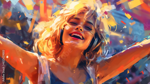 happy smiling woman immersed in herself dancing in a disco, abstract impressionism style illustration. Generative AI.