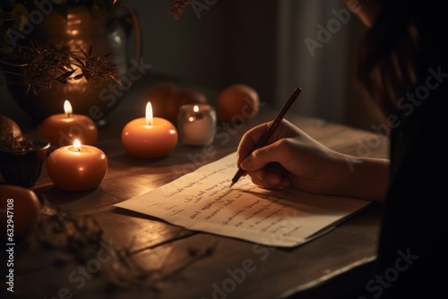 Close up hands of a person writing a heartfelt Rosh Hashanah card, expressing wishes of love and blessings to friends and family. The thoughtful and personal nature of the gesture. Generative AI.