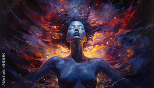 #650851519Illustration captures a man's astral journey, his soul departing his body, embarking on a metaphysical adventure beyond the realm of the physical. Generative AI