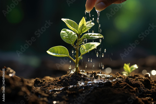 Watering a plant that is growing, symbolizing nurturing, care, and the process of growth and development. Generative Ai.