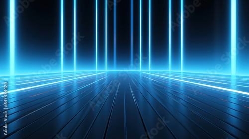 Abstract dark background with glowing blue light and long white rays on a black floor, an empty scene for the display of a product or object in a virtual space. generative ai