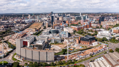 Aerial view of a Birmingham cityscape skyline with HS2 construction site