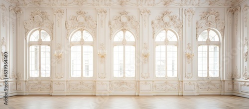 Luxurious spacious room with a regal and opulent ambiance adorned with stucco decorations on high walls and ceiling filled with sunlight and an extra white color scheme