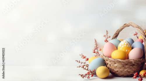 Basket of colorful easter eggs on white copyspace background. Chocolate candy in studio