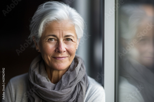 Portrait of a smiling aged woman with gray hair looking at camera, near the window.