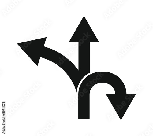 Three Way Direction Arrow Icons, Triple Directional Road Icon Sign, Traffic Sign, Three Way Decision Opportunity Option Arrow Symbol 3 Path Pointing Choice, Y Intersection Sign Vector Illustration