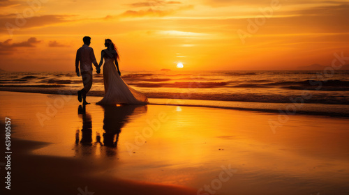 Bride and groom, newlyweds, honeymoon on the beach sunset
