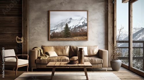 alpine cabin interior living room space, rustic-inspired design, modern furniture, painting canvas on the wall