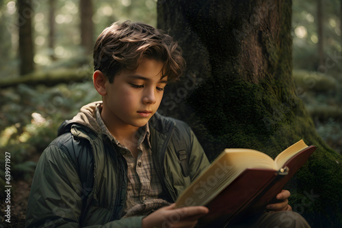 Young Boy Reading Magical Book In Enchanted Garden. Concept of Fantasy Reading, Enchanted Garden, Magical Realm, Imaginative Journey, Captivating Tale, Young Reader’s Escape, Whimsical Setting.
