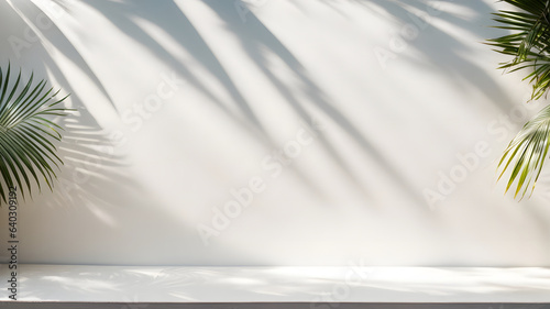 Minimal white wall background with palm tree leaves and shadows. Tropical background scene for product placement, product presentation, or product showcase.