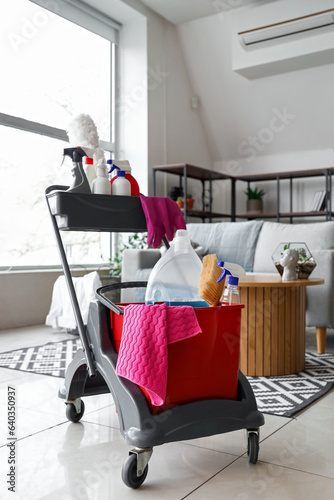 #926940158Modern upright steamer indoors, closeup. Space for text