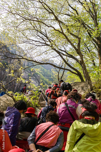 KUMGANGSAN TOURIST REGION, NORTH KOREA - APRIL 29, 2008: a group of South Korean tourists climbs to Kuryong Falls viewpoint