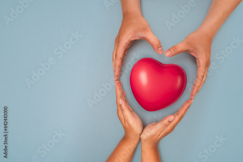 Adult hands around red heart on light blue pastel background , health care, organ donation, family life insurance, world heart day, world health day, praying concept.