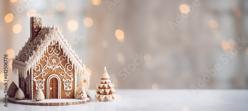 Glazed gingerbread house with holiday lights in background. Christmas decoration. Tradicional homemade sweets. Banner with copy space