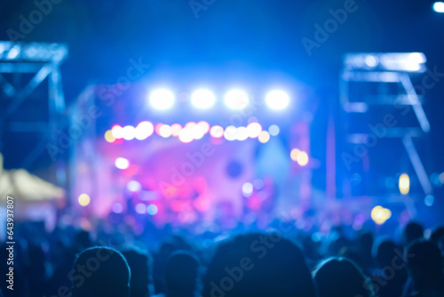 Silhouettes of concert crowd with stage lights, out of focus blurred photo