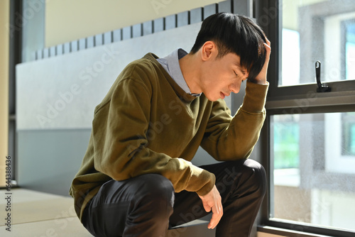 Unhappy young man holding his head, suffering from depression. Loneliness, depression, mental heath concept