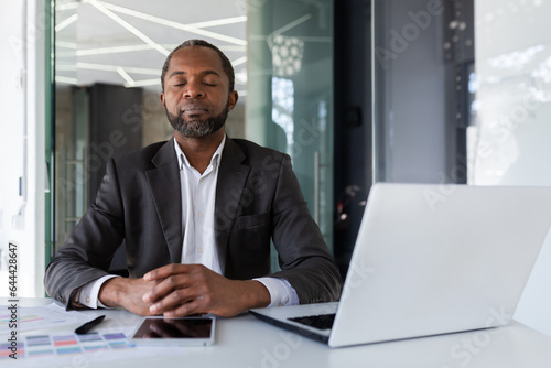 Balanced and calm man at workplace inside office, businessman meditating with closed eyes thinking and visualizing future projects and plans financial strategies, boss inside office with laptop.