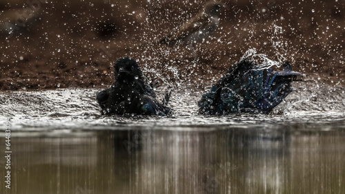 Two Cape Glossy Starling bathing in waterhole in Kruger National park, South Africa ; Specie Lamprotornis nitens family of Sturnidae