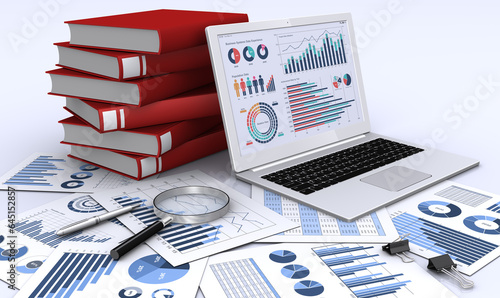 ビジネスデータを表示するノートパソコンとビジネスアイテム、ビジネスデータの分析と検証